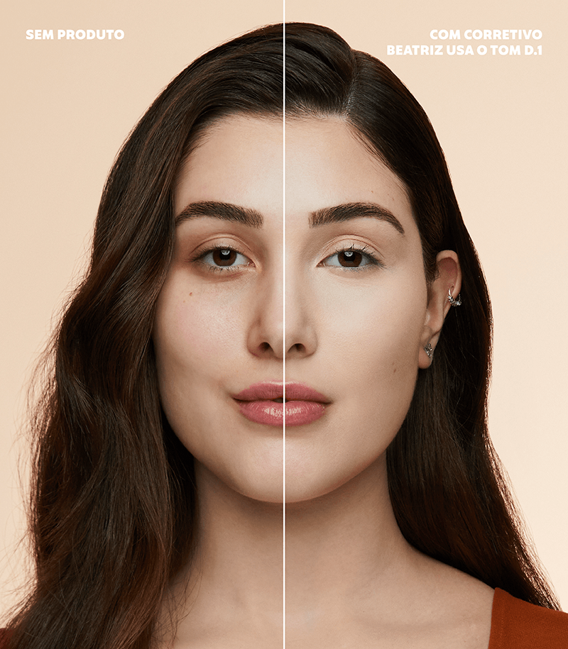 O formato espátula do aplicador é ideal pra depositar a quantidade certa de corretivo! Se você deseja camuflar regiões pontuais, como olheiras e manchinhas, espalhe o produto com leves batidinhas usando o dedo anelar ou um pincel de cerdas curtas e firmes. Você também pode finalizar o make com a sua Base Ultra Cobertura Matte e selar o rosto com o Pó Solto Ultrafino.