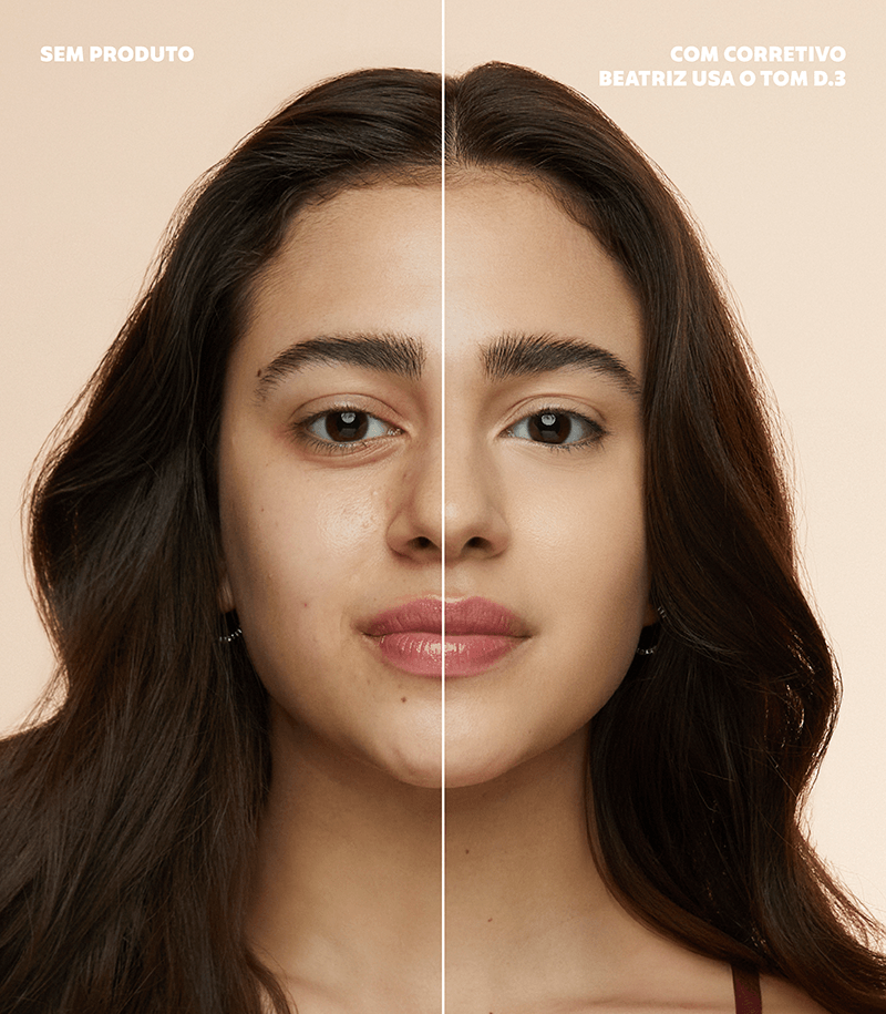 Além de ser ideal pra corrigir olheiras e imperfeições, o nosso corretivo também pode ser usado pra fazer a pele completa, sabia? Nos dias em que você quer praticidade ou um simples retoque no make, espalhe o produto no rosto com a ajuda do aplicador e esfume dando batidinhas com uma esponjinha. Fica supernatural!