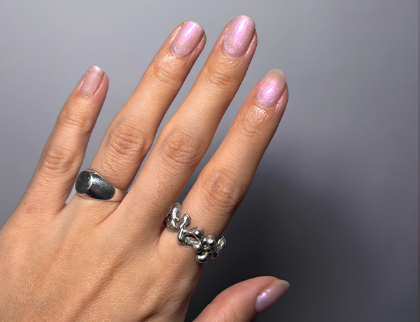 Pra uma pegada mais clean e alienígena, aplique esse vidrinho sobre um esmalte clarinho como o Taça de Cristal. Essa combinação deixa o reflexo rosa com um aspecto superdelicado e tecnológico, parecendo uma pérola vinda diretamente de uma galáxia distante!